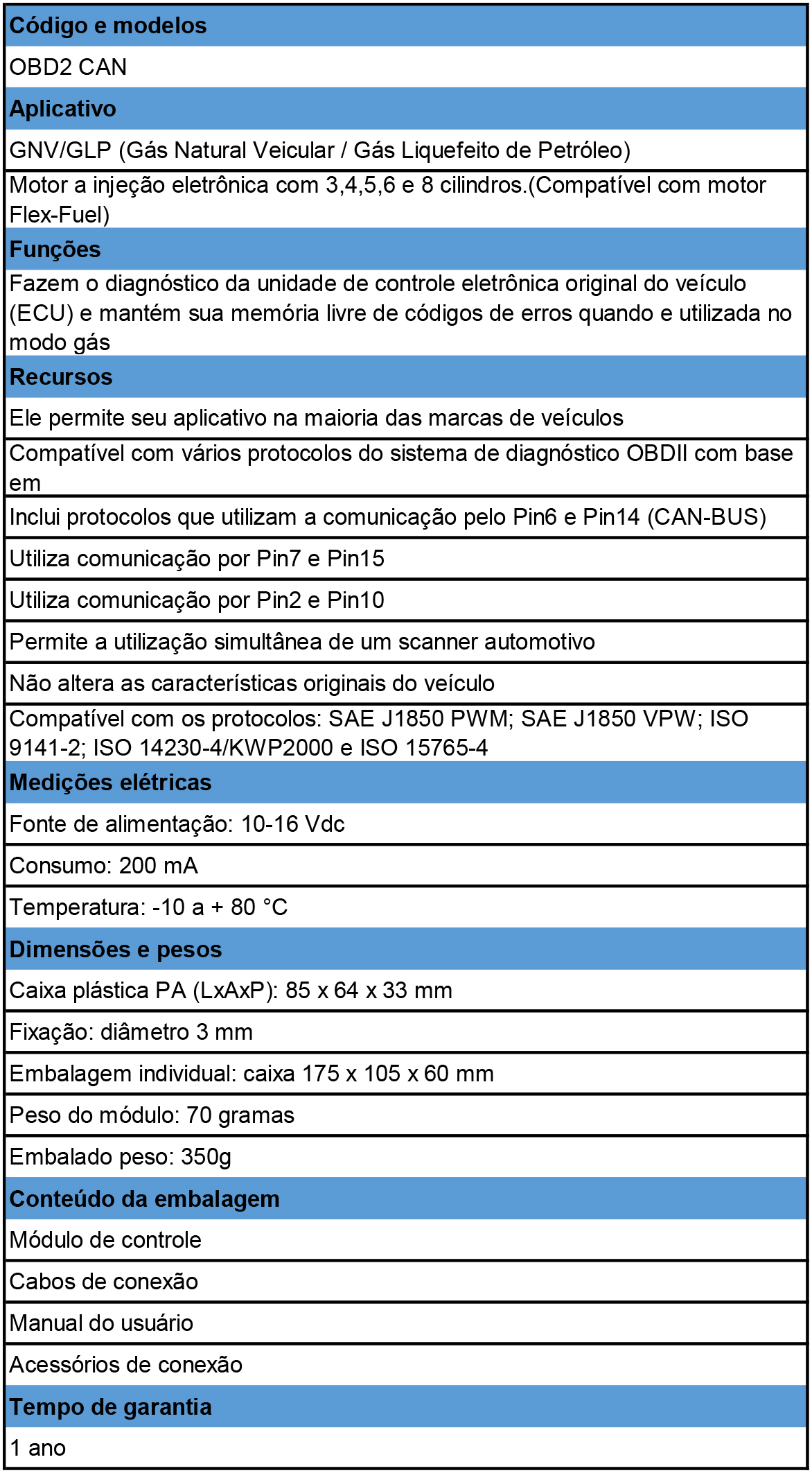 OBD2 CAN é um corretor de ECU compatível com múltiplos protocolos baseados no sistema de diagnóstico OBDII, incluindo também os protocolos que utilizam a comunicação por BUS CAN (Pino 6 CAN H e Pino 14 CAL L - de acordo com SAE J2284), permitindo sua aplicação na maioria das marcas de veículos. Este corretor é instalado no conector de diagnóstico padronizado de 16 pinos original do veículo (ISO 15031-3:2004 e SAE J1962), sem alterar as características originais do mesmo, também permitindo o uso simultâneo de um scanner automotivo.