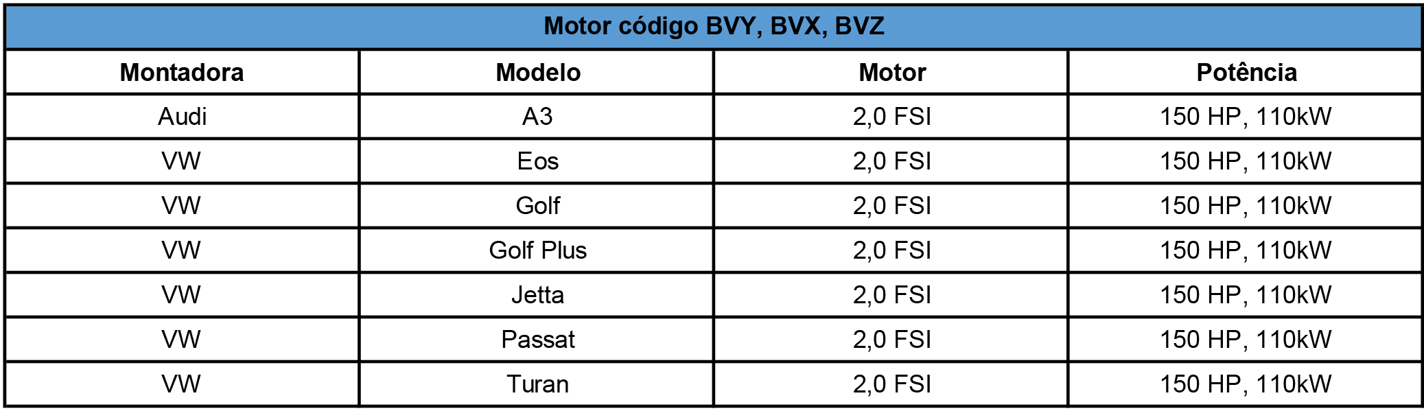 Tabela de carros correspondentes ao mini kit: