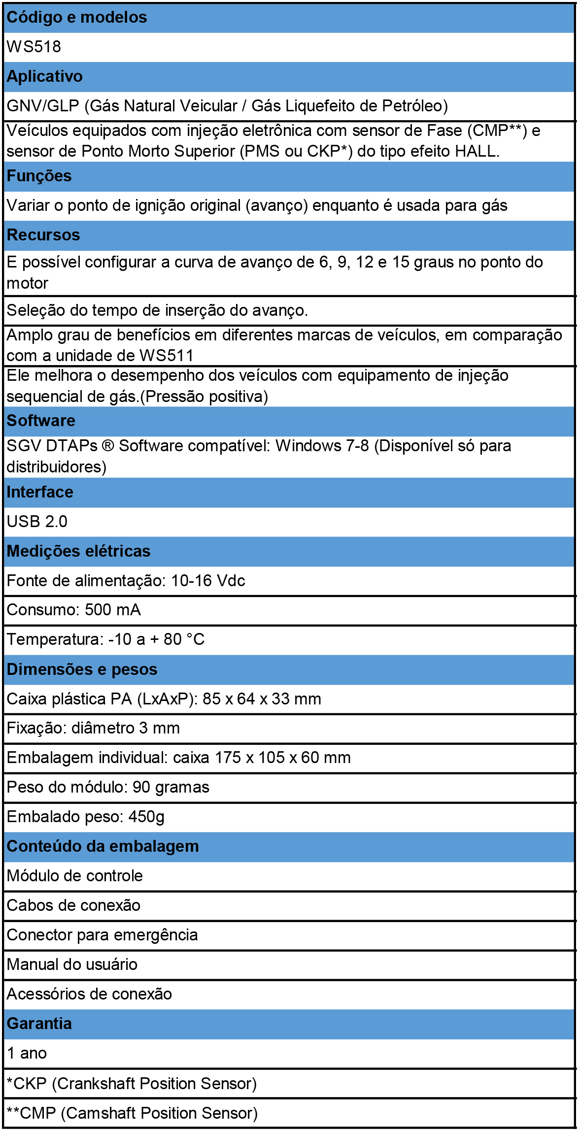 Warrior WS518 é um variador de avanço eletrônico para instalar em veículos equipados com injeção eletrônica com sensor de Fase (CMP**) e sensor de Ponto Morto Superior (PMS ou CKP*) do tipo efeito HALL.