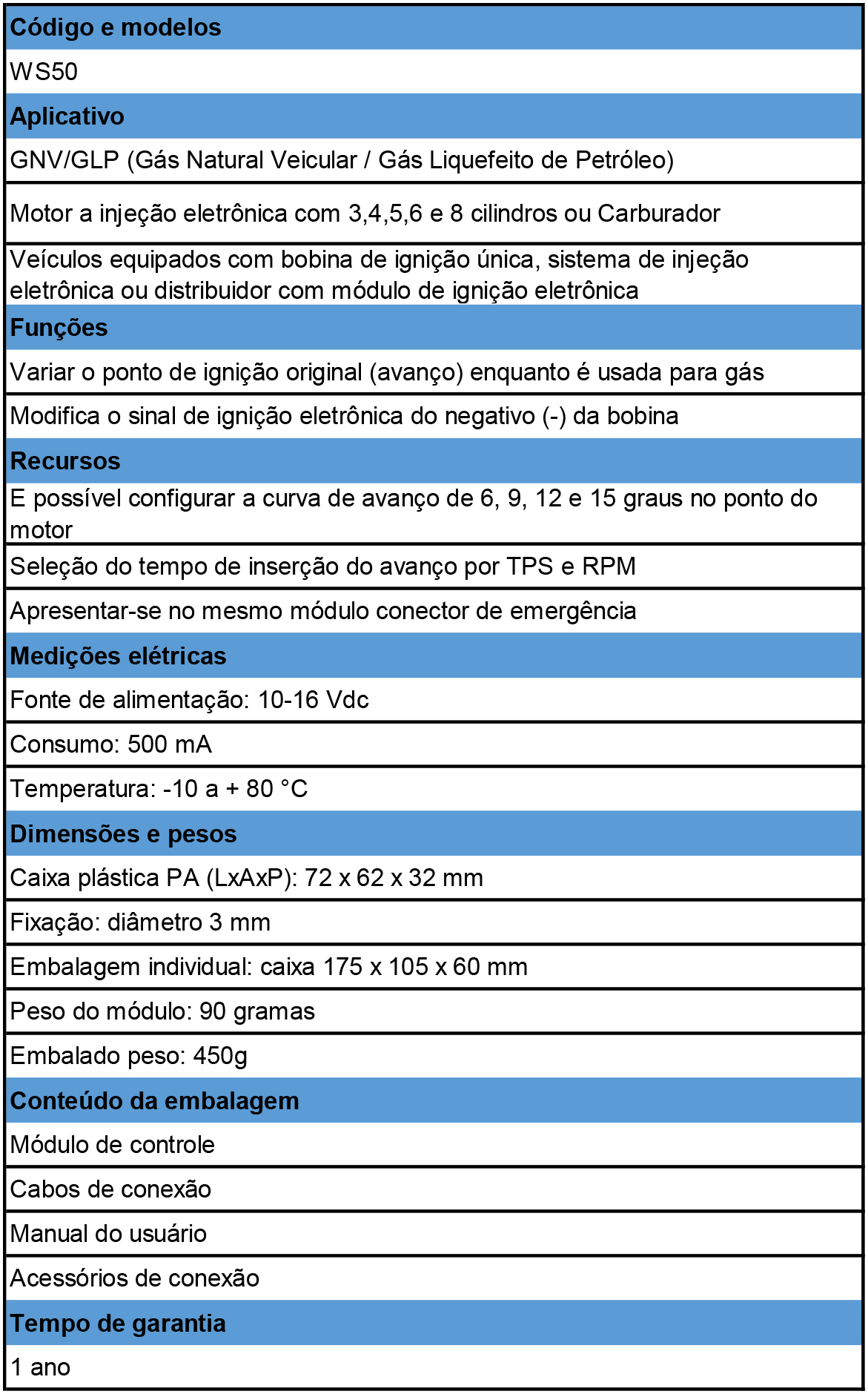 Warrior WS50 é um variador de avanço eletrônico para instalação em veículos equipados com bobina de ignição única, sistema de injeção eletrônica ou distribuidor com módulo de ignição eletrônica. Usando chaves de seleção presentes no mesmo módulo, e possível configurar a curva de avanço de 6, 9, 12 e 15 graus no ponto do motor e também escolher o momento de inserção do avance.